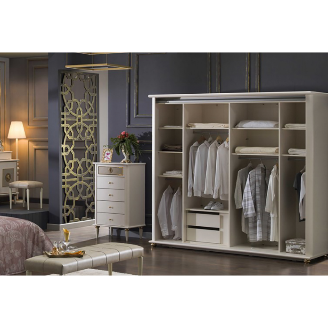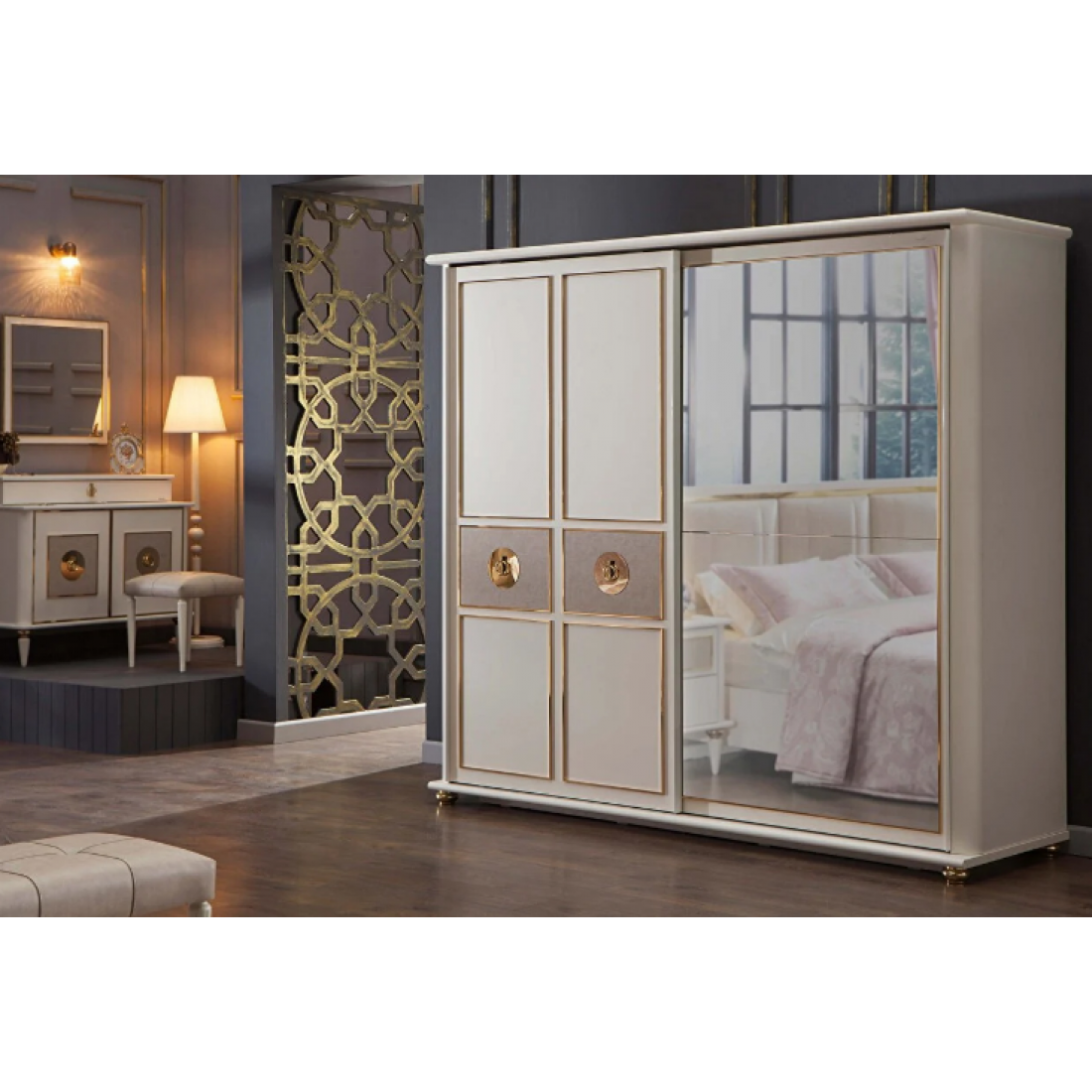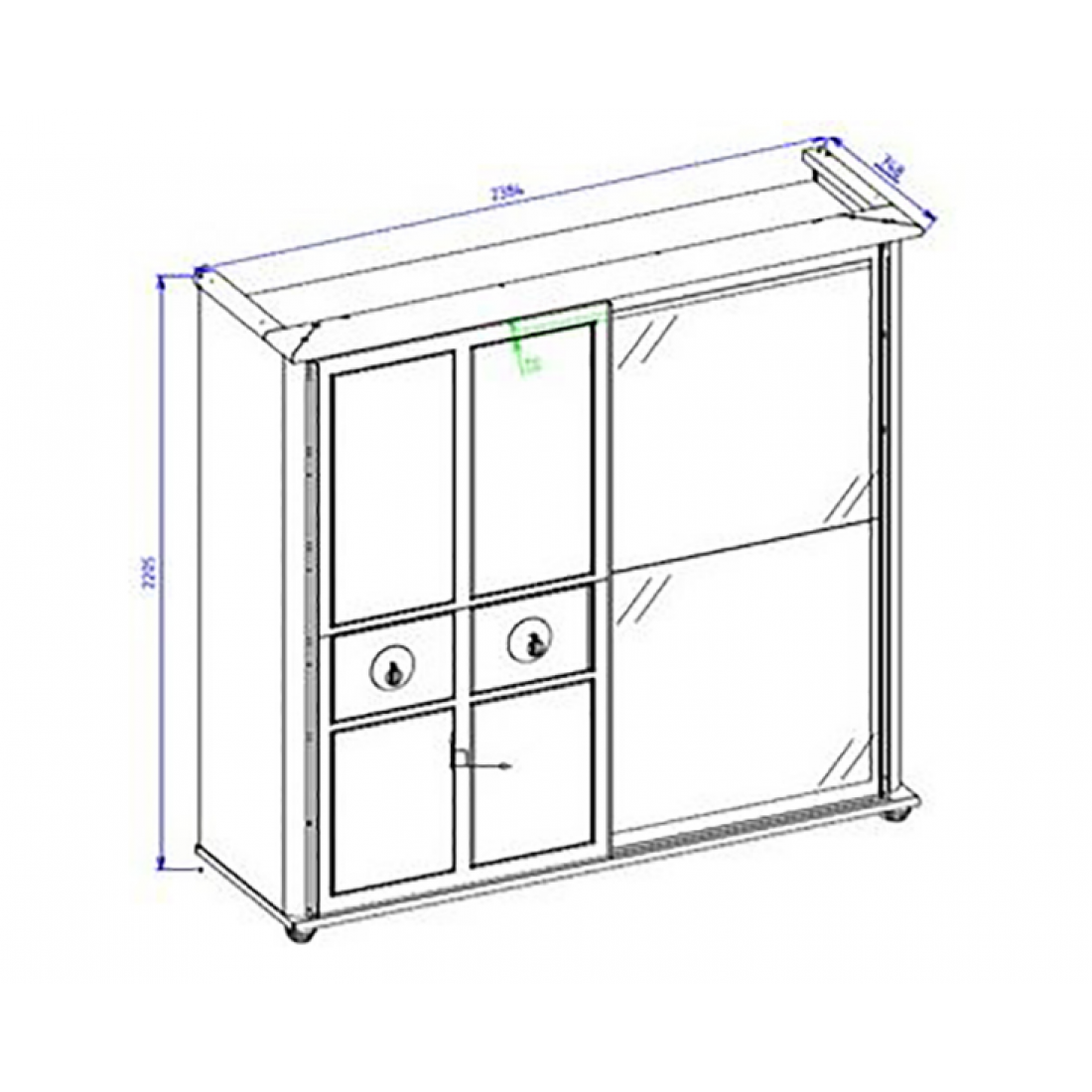 Шкаф-купе платяной шкаф Mistral изготовлен из высококачественного ЛДСП производства Турция, класс эмиссии формальдегидов Е1. Одна зеркальная дверь, другая- с золотой отделкой. Наполнение шкафа: 3 полки+ штанга- узкое отделение слева, 1 полка+ штанга + ящики в широком отделении слева, 2 полки+ штанга- в широком отделении справа, 2 полки + штанга в узком отделении справа.