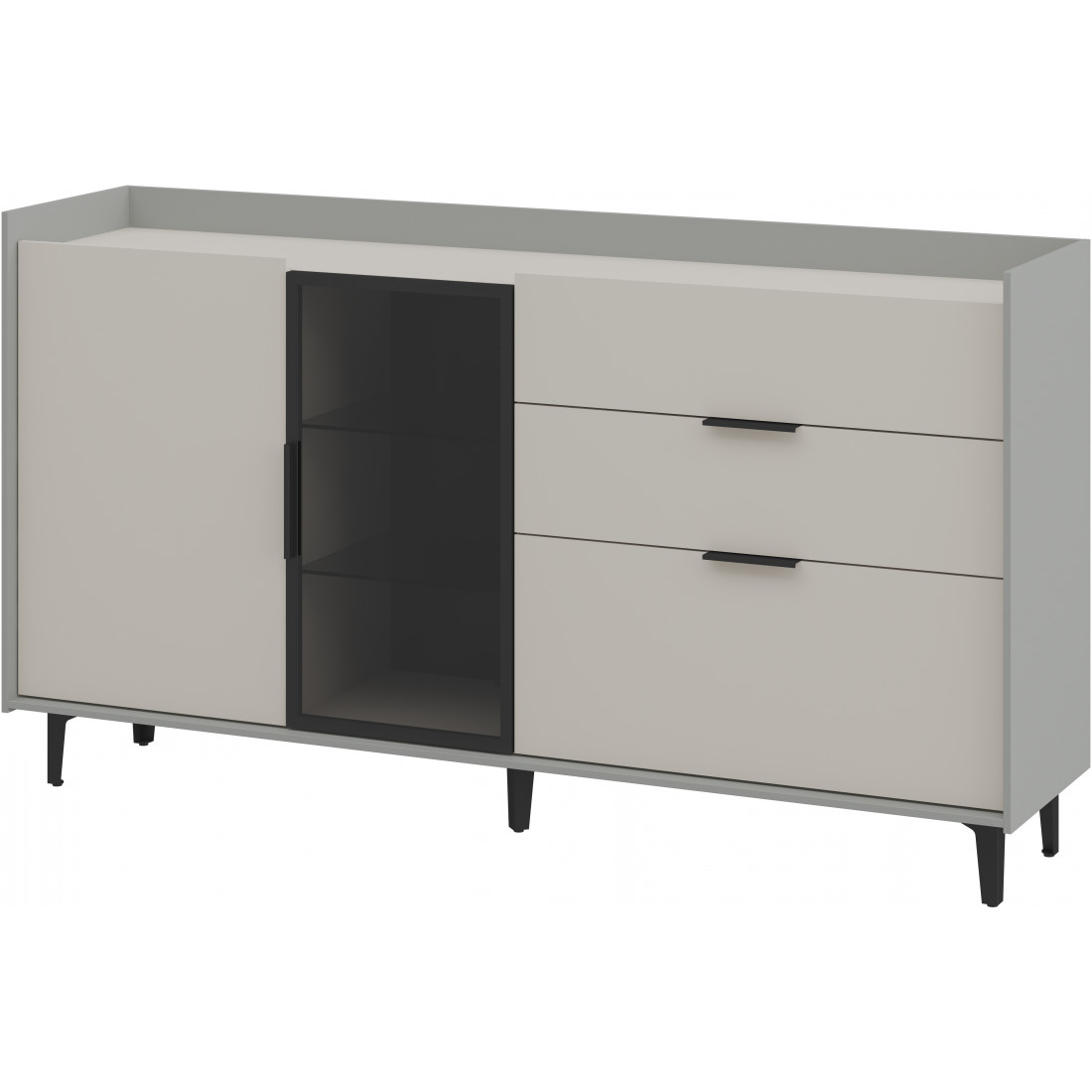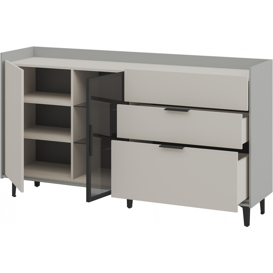 Элегантная тумба Модена создает идеальный акцент в вашей гостиной. Выберите из трех стильных вариантов цветов: Белый-Дуб Элисон, Лунный камень-жемчуг, Металл Бруклин-лунный жемчуг. Ножки из металла с регулировкой обеспечивают стабильность. Эта большая тумба идеально подходит для размещения телевизора и хранения посуды. Тумба оснащена темным стеклом и имеет три отделения: первое с двумя полками, второе с двумя стеклянными полками и фасадом из стекла, третье с тремя удобными ящиками. Функциональность и стиль объединяются в этой тумбе, делая ее идеальным дополнением к вашему интерьеру гостиной
