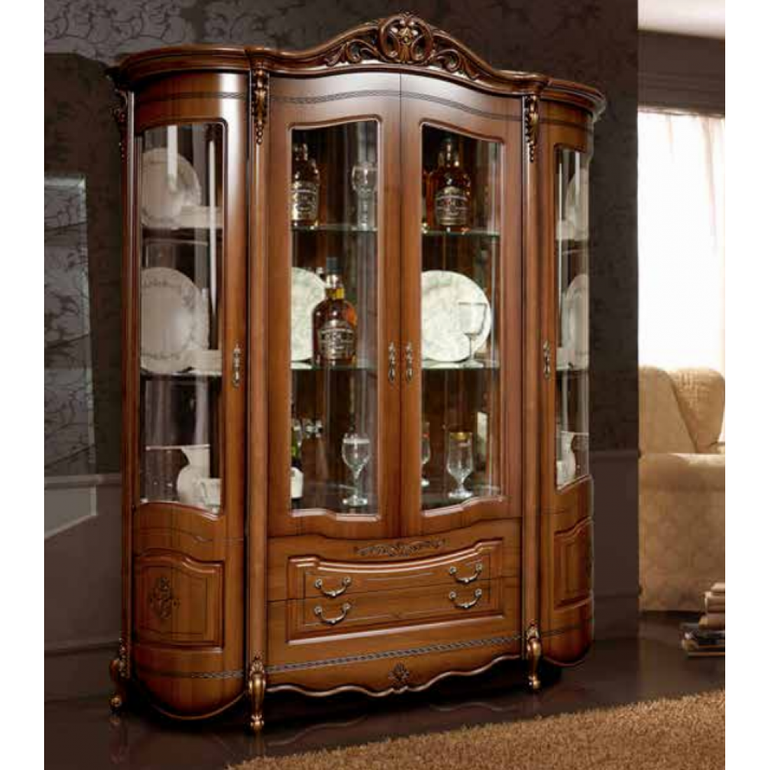 Шкаф-витрина четырехдверная Аллегро 1 (орех) – данная модель сделает вашу гостиную неповторимой и нарядной.  Ее стеклянные дверцы и зеркальный корпус придадут комнате светлую атмосферу, а стеклянные полки для посуды сделают эту витрину легкой и воздушной даже не смотря на ее мощный с первого взгляда фасад. Такая витрина подчеркнет классический стиль и послужит показателем богатства и престижа хозяев дома.